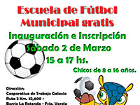 La Municipalidad de F. Varela informa que el próximo sábado 2 de marzo, de 15 a 17 hs., comienza la inscripción para formar parte de la Escuela Deportiva municipal gratuita de Futbol 11, para niños de 8 a 16 años, en la sede de la Cooperativa de Trabajo Galaxia, ubicada en Ruta 36 - km 32.600 del barrio La Rotonda