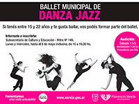 La Municipalidad de Florencio Varela informa que está abierta la inscripción para formar parte del nuevo Ballet Municipal de Danza Jazz. Si tenés entre 15 y 22 años y te gusta bailar, podés acercarte los Lunes y Miércoles hasta el 8 de mayo inclusive, de 15 a 19.30 hs. a la Subsecretaría de Cultura y Educación, Mitre 149. La audición será el sábado 11 de mayo. A partir de las 7.30 hs. se entregarán las acreditaciones y los interesados deben acercarse con su DNI.