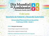 La Municipalidad de Florencio Varela invita a todos los vecinos a participar de las actividades por el “Día Mundial del Ambiente”, que tendrán lugar este mediodía a partir de las 12.30 hs. en la Sede de la Universidad Nacional Arturo Jauretche, Av. Calchaquí 6200. Durante la jornada, se recibirá a alumnos de diferentes escuelas, habrá shows de magia y de títeres y se realizará el juramento ambiental por parte de los chicos de 4to, 5to y 6to grado. Por último, se hará una recorrida por los stands ambientales. También se invita a participar de la inauguración de los equipamientos de la Unidad Sanitaria Ambiental en el Centro de Salud Bosques Norte, Marcos Paz esq. Santa Teresita, a partir de las 15 hs. Las actividades realizadas en el marco de esta fecha, continuarán el miércoles partir de las 17 hs. en la UNAJ, que desarrollará la Segunda semana universitaria del Ambiente y el Desarrollo Sustentable, con charlas a cargo de profesionales en el tema.