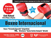 La Municipalidad de Florencio Varela informa que la velada boxística pactada para 15 de junio, se reprogramó para el próximo viernes 21, a las 21 horas, cuando el boxeador varelense Fernando Saucedo, reciba al brasileño Isaias Santos Sampaio, en una pelea por el Título Latino Super Pluma CMB. El motivo de la reprogramación fue debido a que la TV Publica televisará el encuentro que se llevará cabo en el Club Nahuel (Urquiza y 25 de Mayo), donde además habrá otros 7 combates preliminares. Cabe recordar que la última presentación de Saucedo fue en el distrito, en el mes de enero, cuando el deportista local revalidó su título “Mundo Hispano”, ganándole al brasilero Edilson Ríos por knock out técnico en el 1 min. 47 seg. del 7° round. Por otro lado, el boxeador que será visitante, viene de perder por knock out ante el mexicano Daniel Estrada, en una pelea por el título mundial plata del Consejo Mundial de Boxeo, realizada en el mes de abril. Cabe destacar que las entradas se compran en el Club Nahuel, de lunes a domingo de 12 a 20 hs.