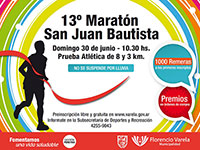 La Municipalidad de Flrencio Varela recuerda que está abierta la inscripción para participar de la “Maratón San Juan Bautista”, tradicional prueba atlética de 8 y 3 km., que recorrerá las calles de nuestra ciudad el próximo 30 junio. La competencia, que se realizará en el distrito por decimotercer año consecutivo, en su última edición supo reunir a más de 800 participantes, gran parte de ellos varelenses y otros tantos provenientes de municipios como Cañuelas, Merlo, Ensenada, La Florida, Quilmes, Berazategui, Lobos y Lomas de Zamora, entre otros. De hecho, el último ganador de la prueba fue Gustavo Comba, atleta de Banfield, con un tiempo de 24’ 44”. En referencia a la convocatoria, según se informó desde la Subsecretaría de Deportes y Recreación, a la fecha ya se pre-inscribieron más de 300 competidores. Cabe destacar que la prueba de 8 km. estará compuesta por 12 categorías, siendo requisito tener más de 17 años de edad para poder participar, tanto en damas como en caballeros. Por otro lado, la prueba de 3 km. constará de tres clases: Pre-infantiles (de 10, 11 y 12 años); Infantiles (de 13 a 14 años); y Menores (de 15 a 16 años) Vale destacar que la inscripción es libre y gratuita, y se puede gestionar a través de la página del Municipio www.varela.gov.ar o llamando a la Subsecretaría de Deportes y Recreación, al 4255-9043 de 8 a 17 hs. Habrá importantes premios en órdenes de compras, y remeras para los primeros 1000 inscriptos. NO se suspende por lluvia.
