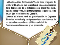 La Municipalidad de Florencio Varela invita a todos los vecinos y trabajadores de prensa del distrito, a participar del acto que se realizará en conmemoración de la declaración del Día de la Independencia Patria, a celebrarse el próximo martes 9 de Julio, a partir de las 10 hs. en el Monumento a la Bandera (Av. San Martín esquina Castelli). El mismo, contará con la presencia de la Orquesta Sinfónica Municipal.