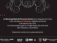 La Municipalidad de Florencio Varela invita a todos los vecinos del distrito a disfrutar de la Ópera “La Traviata”, que se realizará el próximo viernes 9 de Agosto a las 19 hs. en el Salón Nago (Mar Chiquita y Tres de Febrero). El concierto, a cargo de la Orquesta Sinfónica Municipal, será con entrada libre y gratuita, para que disfruten todos los varelenses.