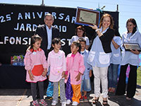 En este marco, agradeció a docentes y padres por la dedicación y el trabajo por los chicos, que disfrazados de murgueros esperaban para hacer su presentación. Asimismo, en conmemoración a estas bodas de plata, hizo entrega de una placa a su Directora Marcela Lencina, quien agradeció su visita con un presente, hizo un breve repaso sobre la historia del jardín y destacó la importancia de que “a pesar de los años y los cambios, la institución continúe creciendo”. Click para agrandarPor último, los alumnos del nivel inicial junto a sus docentes terminaron el acto bailando murga y realizaron una muestra sobre la historia del jardín y la escritora que mereció el nombre del establecimiento: Alfonsina Storni.