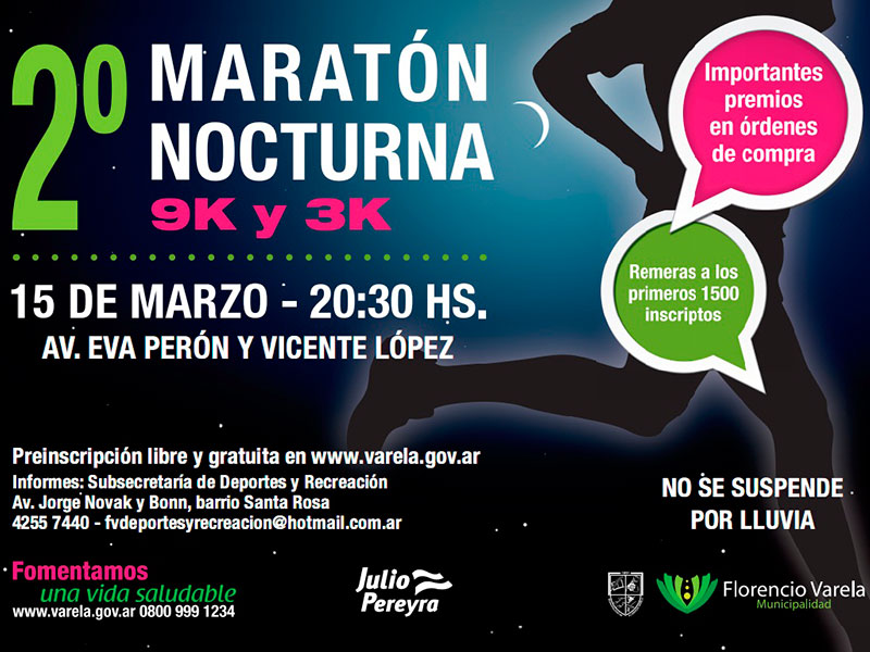 La competencia, que en su primera edición supo reunir a más de 1800 competidores, este año dispondrá de dos pruebas atléticas de 9 y 3 km (diferenciándose del año pasado cuando constó de pruebas de 5 y 1,5 km). La largada para ambas pruebas será desde Av. Eva Perón y Vicente López, desde las 20:30 hs. Inscripción online La misma puede realizarse en la página de la Municipalidad: www.varela.gov.ar. Allí podrás completar todos tus datos y a la brevedad recibirás un mail constatando tu preinscripción. Para finalizar, deberás acercarte el día de la competencia al stand que se encontrará en el lugar de largada (Av. Eva Perón y Vicente López), entre las 18.30 y las 20 hs. Si sos mayor de 17 años y no querés realizar la maratón de 9 Km., podés anotarte en la maratón participativa de 3 km. Además, aquellas personas que no hayan realizado la preinscripción vía web, podrán hacerlo personalmente el día de la competencia a partir de las 18:30 hs hasta las 20hs. Para más información, comuníquese con la Subsecretaría de Deportes y Recreación, Av. Jorge Novak y Bonn, barrio Santa Rosa. Tel. 4255-7440, o envíe un mail a fvdeportesyrecreacion@hotmail.com.ar
