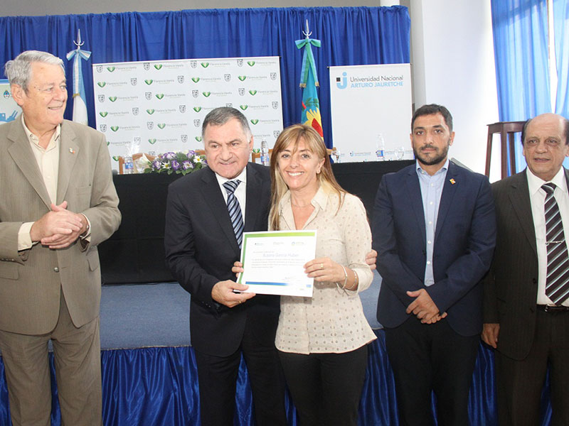 En tanto, destacó la importancia del Posgrado en Producción más Limpia que se dictará en la casa de altos estudios varelense. Durante el acto, se realizó una entrega simbólica de 10 aportes no reembolsables y certificados de cumplimiento del Programa Federal “Producción más limpia” (P+L) a empresarios de Florencio Varela y Berazategui, y 13 becas para el curso de Posgrado en Producción más Limpia. Cabe destacar que el plan nacional es una estrategia ambiental preventiva, que tiende a disminuir la contaminación producida por las industrias y sus procesos a través de su acción sobre los insumos, la tecnología y productos asociados. Del mismo modo esta política actúa preservando fuentes básicas como la energía y el agua, promoviendo su ahorro. En tanto, a través de las becas se trata de formar y fortalecer a los actores del sector público nacional, provincial y municipal, mejorando sus capacidades técnicas y de gestión para llevar adelante tareas vinculadas con la implementación de políticas de producción más limpia. Además estuvieron presentes, el Vicerrector de la Universidad Nacional “Arturo Jauretche” Doctor Arnaldo Medina; el Intendente de Berazategui, Doctor Juan Patricio Mussi; el Diputado Provincial, Doctor Juan José Mussi; el Diputado Nacional, Carlos Kunkel; el Jefe de Gabinete de la Secretaría de Ambiente y Desarrollo Sustentable de la Nación, Doctor Raúl Fernández; la presidenta del Honorable Consejo Deliberante, Laura Ravagni; el Secretario de Ambiente y Desarrollo Sustentable de Florencio Varela; Doctor Mario Kanashiro y el Coordinador de la Carrera de Gestión Ambiental, Licenciado Luis Couyoupeetrou, vecinos, estudiantes y demás funcionarios presentes.