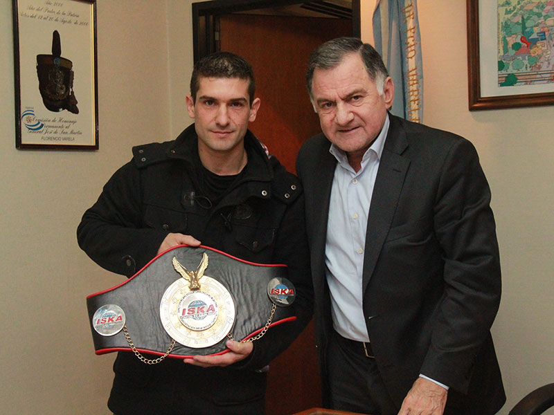 En la mañana de ayer, el intendente Julio Pereyra recibió en su despacho al campeón argentino de kick boxing, Elbio Carreras, quien le llevó propuestas de esa disciplina para el distrito. En ese contexto, el joven deportista varelense le mostró su título de campeón mundial al jefe comunal y le contó cómo fueron sus inicios en el deporte. En tanto, Julio Pereyra, le ofreció todo su apoyo para que continúe con la carrera y que la misma pueda ser difundida y promocionada a través de actividades recreativas.