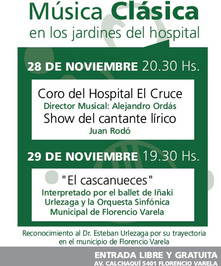 La Municipalidad de Florencio Varela informa que este viernes y sábado, en los jardines del Hospital de Alta Complejidad en Red, "Dr. Néstor Kirchner" (Avenida Calchaquí 5401), tendrán lugar dos jornadas de música clásica, con entrada libre y gratuita.