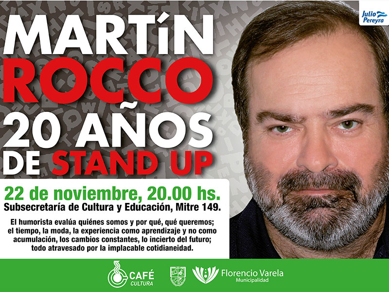 La Municipalidad de Florencio Varela invita a todos los vecinos del distrito a participar con entrada libre y gratuita de una función de stand up del humorista Martín Rocco. Tendrá lugar el próximo sábado 22 de Noviembre a las 20 hs. en la Subsecretaría de Cultura y Educación (Mitre N° 149).
