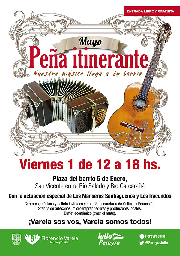 De 12 a 18 hs. Peña Itinerante especial Día del Trabajador. En la Plaza del Barrio 5 de Enero, calle San Vicente entre Río Salado y Río Carcarañá. Jornada de musical con la actuación de ´Los Manseros santiagueños¨, ¨Los Iracundos¨, y demás artistas.