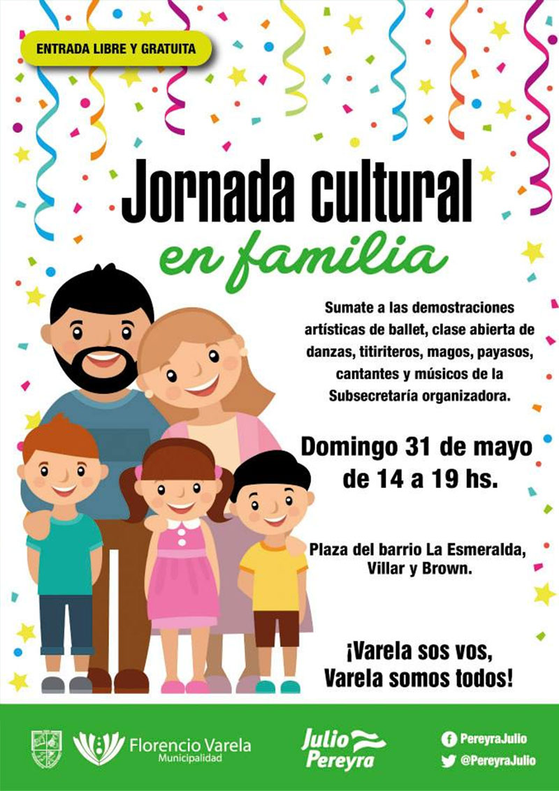 De 14 a 19 hs. Domingo de Cultura en familia. En el barrio La Esmeralda, calle Villar y Brown. Jornada recreativa para toda la familia con títeres, cantantes, músicos, magos, payasos y la presentación especial de “Los Iracundos”.