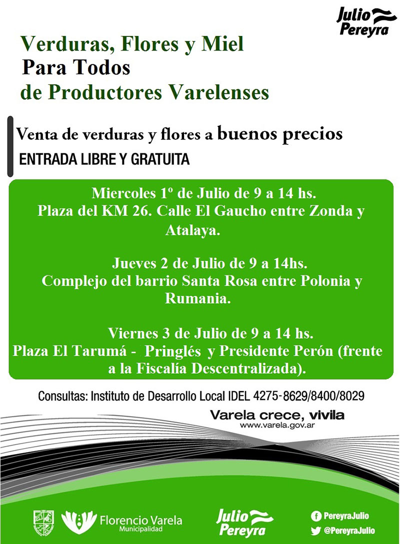 La Municipalidad de Florencio Varela invita a participar a todos los vecinos de la “Venta de Verduras, Flores y miel para Todos” a buenos precios, que se realizarán los siguientes días y horarios: