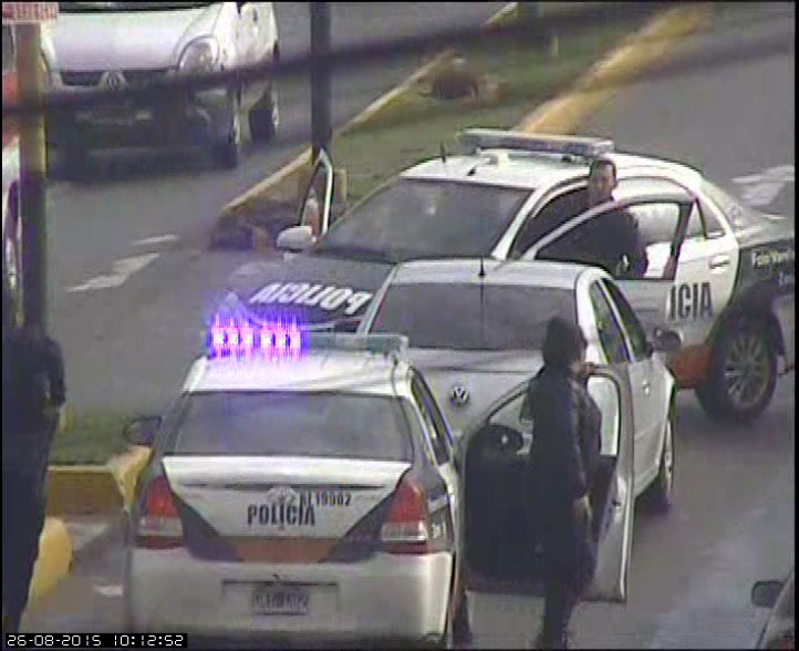 La Sala de Protección Ciudadana realiza un seguimiento a través de las cámaras dispuestas en las cercanías de Av. San Martin y Av. del Trabajo, donde se logra observar cómo los móviles policiales logran interceptan al auto con sus tres ocupantes.