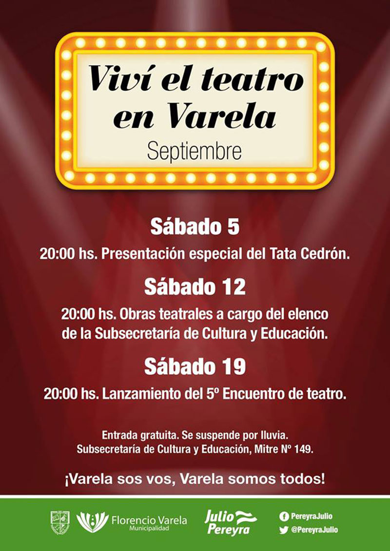 La Municipalidad de Florencio Varela informa que con gran éxito, continúa llevándose a cabo el programa cultural “Viví el teatro en Varela”, que ofrece obras teatrales, música y shows de stand up. Las presentaciones se realizan todos los sábados del mes a las 20 hs., en la Subsecretaría de Cultura y Educación (Mitre 149).