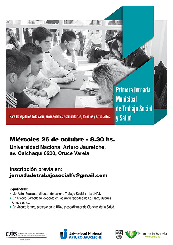 El próximo miércoles 26 de octubre a partir de las 8.30 hs. en la sede de la Universidad Nacional Arturo Jauretche (UNAJ), sita en Av. Calchaquí 6200, tendrá lugar la primera Jornada Municipal de Trabajo Social y Salud.