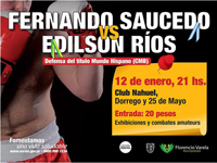 Esta noche tendrá lugar una velada de boxeo internacional con la presentación del boxeador varelense “Fernando Saucedo” vs el brasilero “Isaias Santos Sampaio”. La pelea se llevará a cabo en el Club Nahuel (Dorrego y 25 de Mayo) desde las 21 hs.