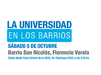 El próximo sábado 5 de Octubre de 10 a 16 hs., la jornada "La Universidad en los Barrios", estará en la plaza de San Nicolás, ubicada en la calle 56 A y Los Tréboles. La iniciativa propone brindar diferentes talleres, charlas, muestras, clases abiertas, capacitación docente y recreación en los diferentes barrios del distrito.