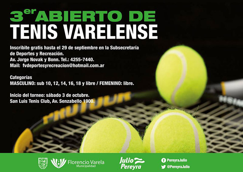 La Municipalidad de Florencio Varela informa que comenzaron las inscripciones gratuitas para el 3er Abierto de Tenis Varelense, que comenzará el próximo sábado 3 de octubre, en las instalaciones de San Luis Tenis Club, ubicado en Av. Senzabello Nº 1900.