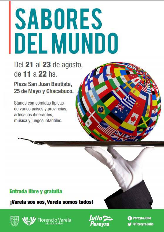 La Municipalidad de Florencio Varela invita a todos los vecinos a disfrutar de la feria itinerante “Sabores del Mundo”, que se instalará en nuestro distrito desde el viernes 21 al domingo 23, de 11 a 22 horas en la plaza San Juan Bautista (calle 25 de Mayo y Chacabuco).